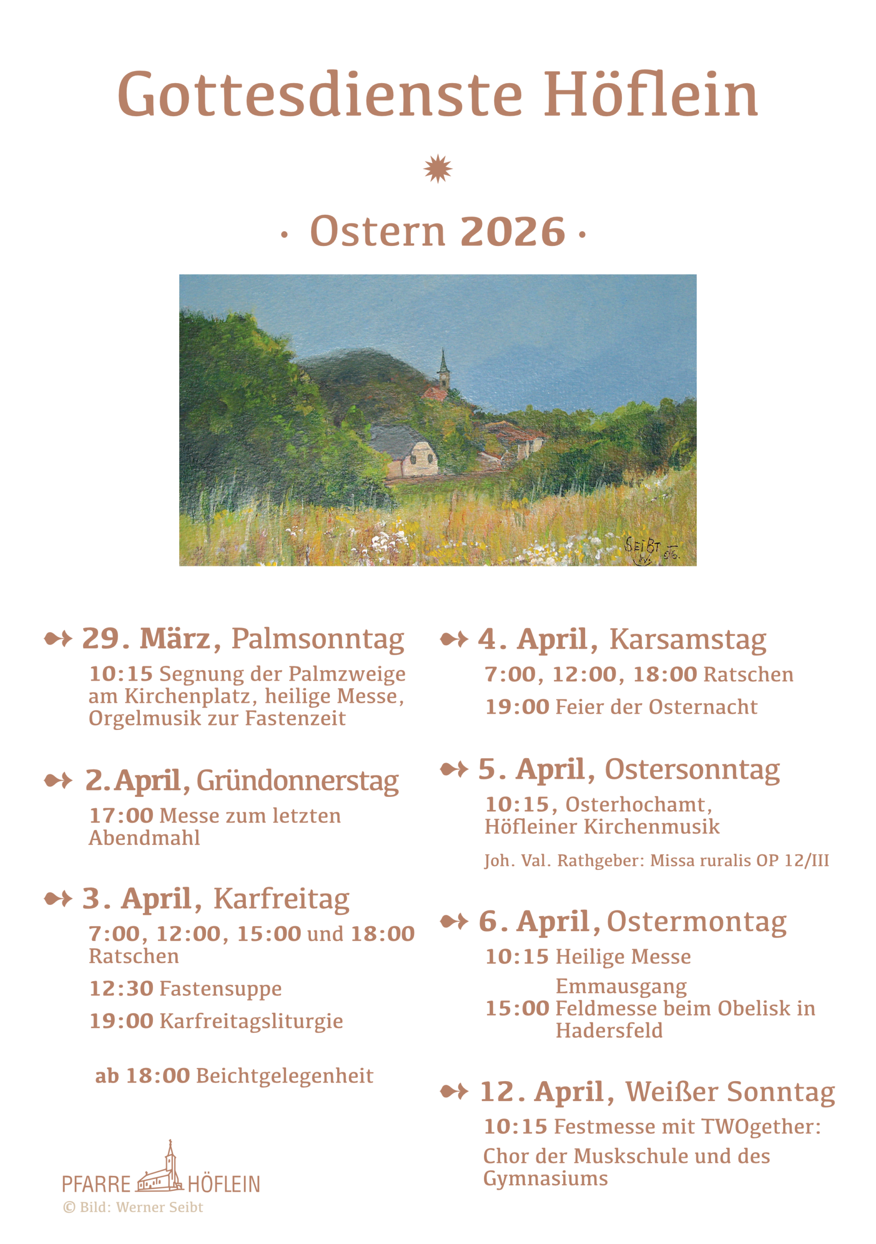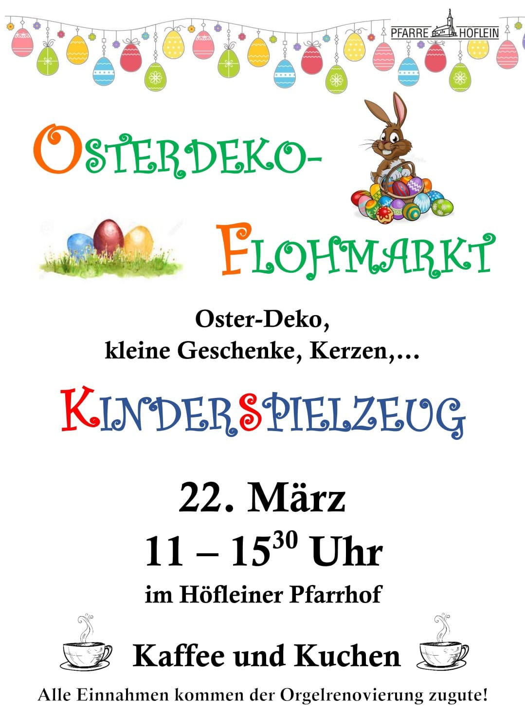 Flohmarkt-Spenden (alles Österliche und Kinderspielsachen) können im Höfleiner Pfarrhof am Mittwoch, 18 März. von 9 bis 11 Uhr abgegeben werden.