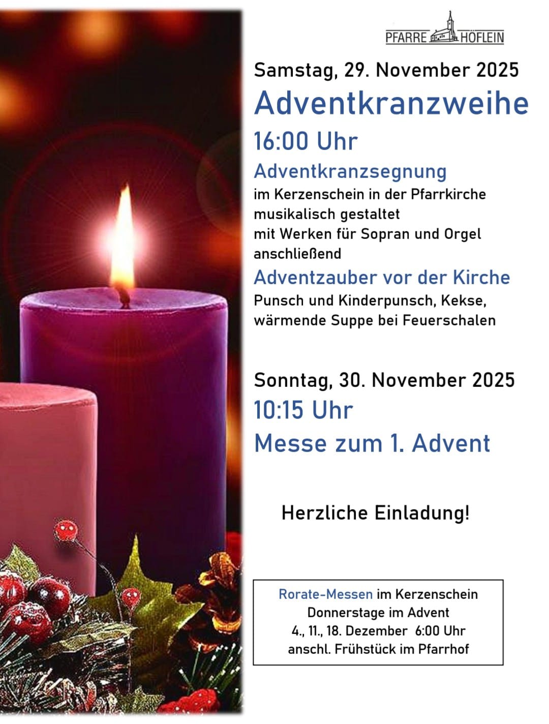 Rorate-Messen jeden Donnerstag im Advent (4.,11.,18. Dezember) um 6 Uhr. Anschließend Agape im Pfarrhof!