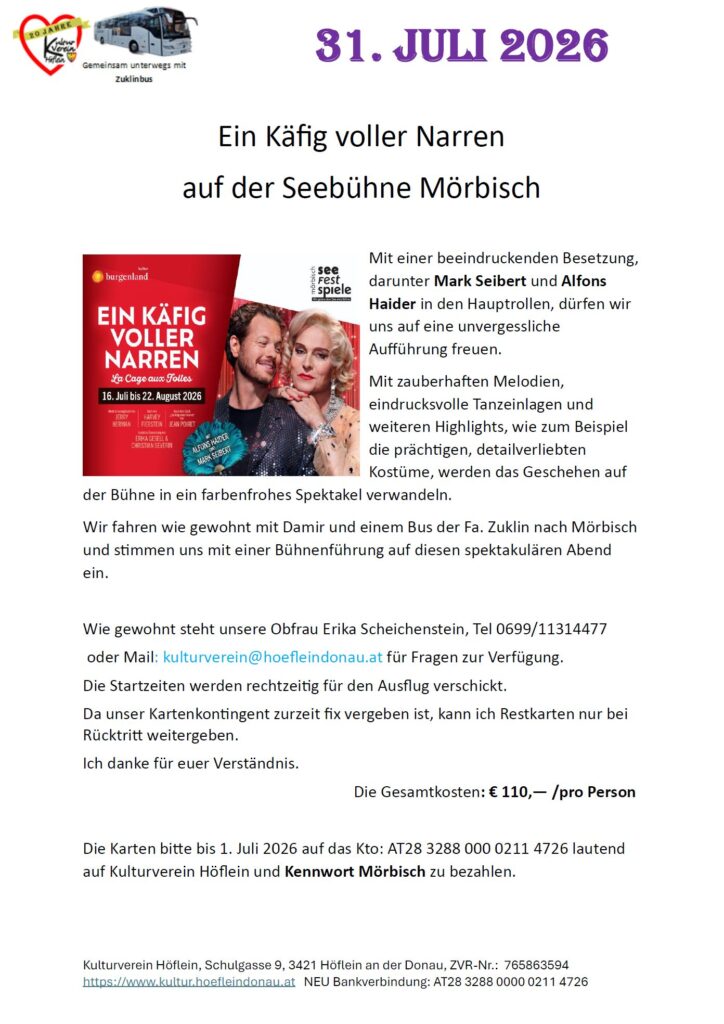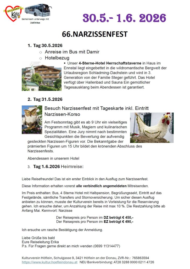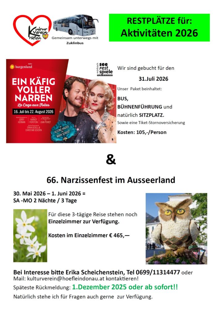 Für alle Veranstaltungen gilt: Bitte meldet euch so schnell wie möglich an, da er überall nur begrenzte Plätze gibt und diese meist schnell vergriffen sind. Anmeldungen über Mail an kulturverein@hoefleindonau.at, oder telefonisch Obfrau 0699 11314477